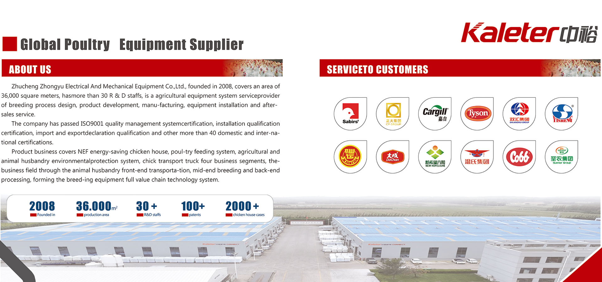 Zhucheng Zhongyu Electromechanical Equipment Co., Ltd. was founded in 2008, covering an area of over 50 mu and having more than 30 R&D personnel. It is a global poultry equipment supplier integrating breeding process design, product research and development, production and manufacturing, equipment installation and after-sales service.