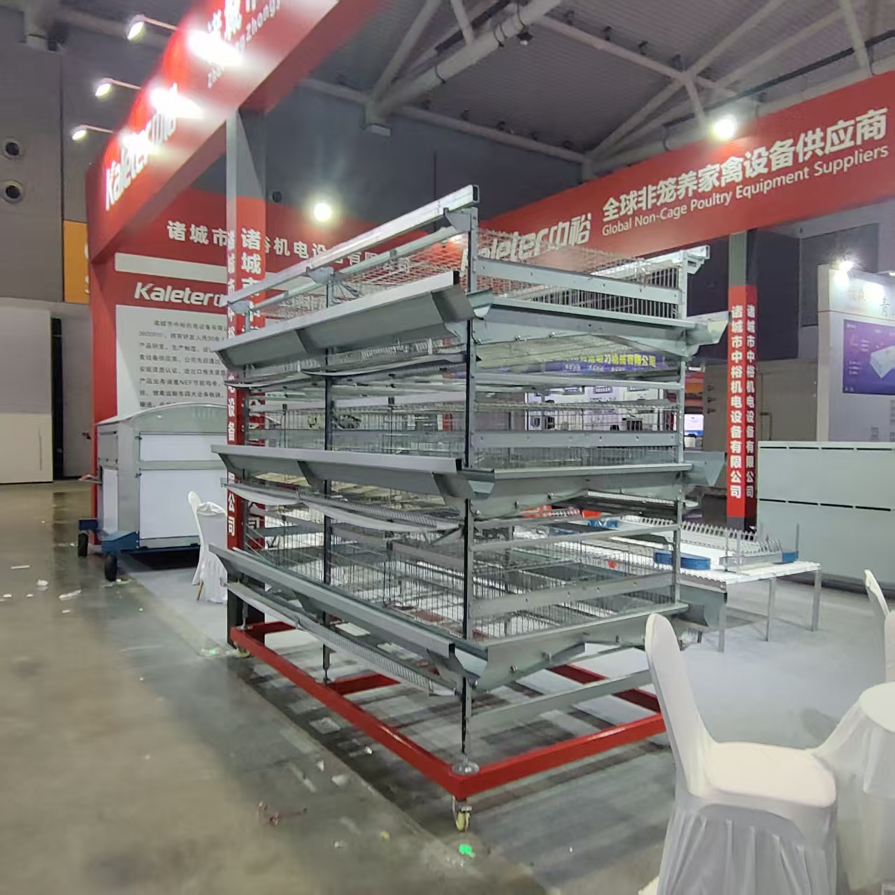 展会上,中裕机电集中展出非笼养系统、大窝产蛋箱、蛋鸡笼三大核心产品,精准匹配当前养殖业升级需求。