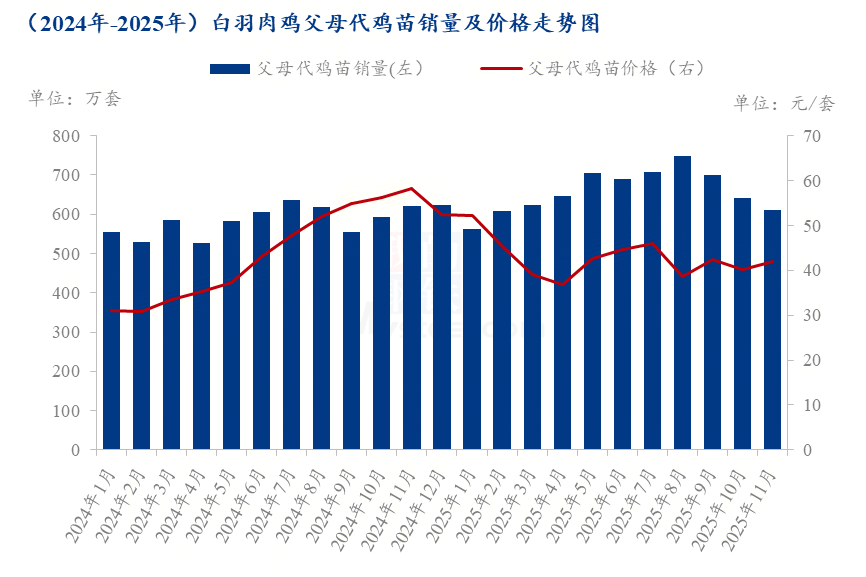此外,从单月销量走势看,除1月份销量低于600万套外,2月至11月父母代鸡苗月均销量达668.08万套,整体供应保持高位且相对稳定,这一态势表明,随着父母代种鸡产能的不断释放,商品代鸡苗的供应能力有望进一步提升,市场供给将更加充裕。