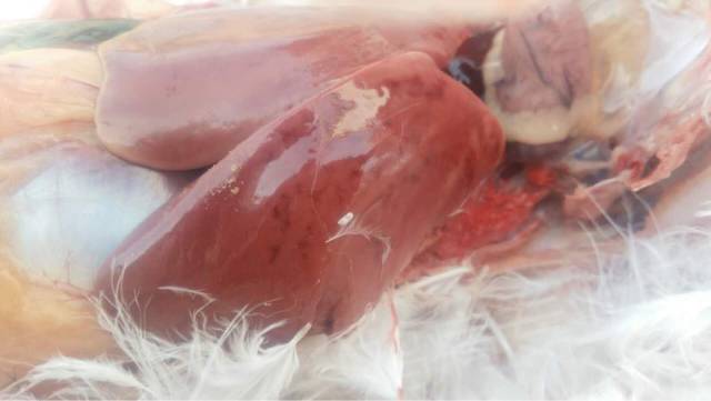 Under natural conditions, dead chickens typically exhibit ovarian degeneration, red fluid in the abdomen, and enlarged liver and spleen. Infection before death and usually in good physical condition, accompanied by a disastrous loss of cockscomb and sagging, but sometimes the condition of the chicken can also be seen to be very poor. Hepatomegaly, bleeding or blood clots can be seen in the abdominal cavity. The liver usually becomes brittle, with colored spots and red, yellow, and/or yellow brown lesions, hematoma under the capsule, and blood clots attached to the surface. The occurrence of coagulation and liver bleeding in the abdominal cavity is often confused with hemorrhagic fatty liver syndrome (HFLS). HFLS usually occurs in laying hens, but hepatitis hemorrhagic syndrome (HS syndrome) does not result in hepatic steatosis.